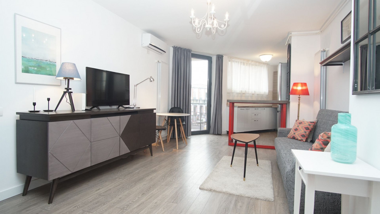 The apartment is well and efficiently divided, has a bright living room, one bedroom, two bathrooms and a very nice terrace, where you can enjoy your coffee before work or a glass of wine after:).