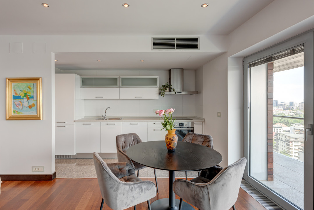 Fiind situat la etajul 18, privelistea de pe terasa se poate descrie in cuvinte, insa cel mai indicat este sa o vedeti in realitate! La suprafata utila a apartamentului, de 74,1 mp, se adauga terasa de 24 mp, pe care va puteti incepe ziua cu o cafea sau savura sfarsitul ei, cu un pahar de vin. Orice ati alege, cu siguranta va veti incarca bateriile!