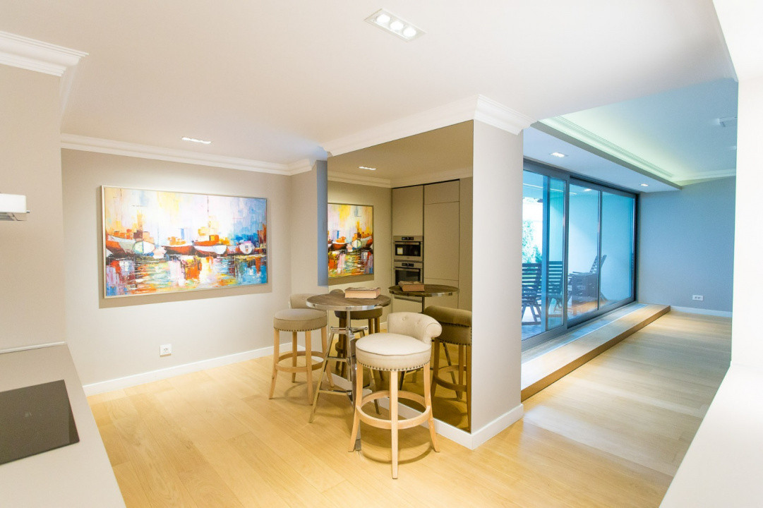 Suprafata de 135 mp utili este eficient compartimentata, cu un living spatios ( 48 mp), o bucatarie ce poate fi inchisa cu sticla (16 mp), dormitorul matrimonial cu zona de dressing (19 mp) si baie proprie, dormitorul mic (15 mp) cu baie comuna cu zona de zi, si un vestibul generos.