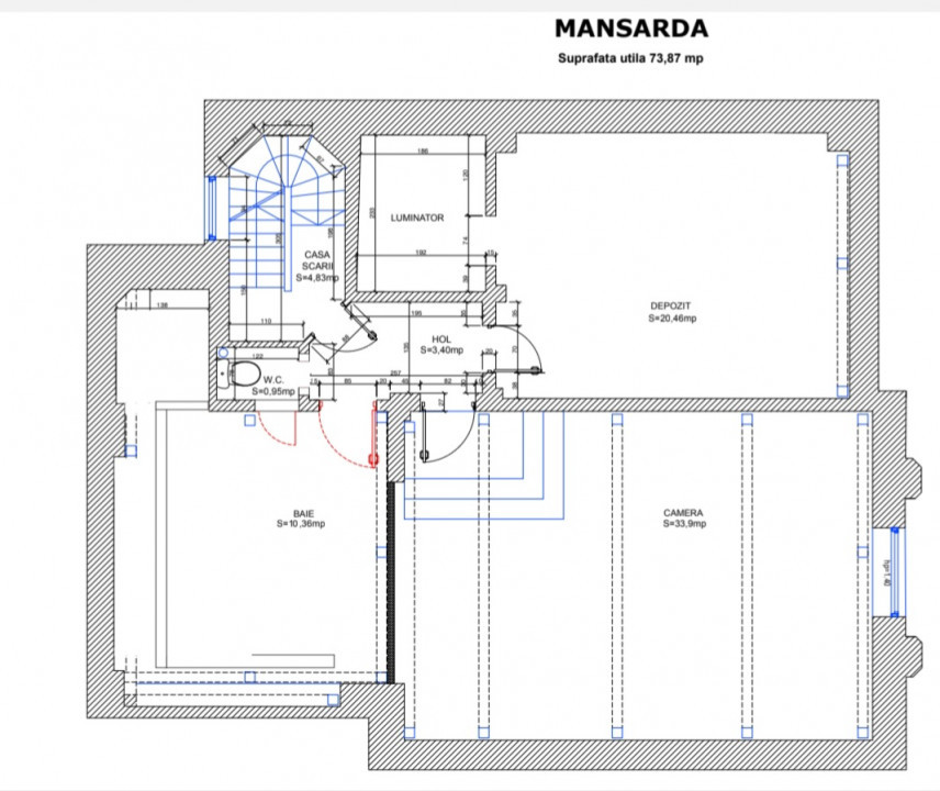- mansarda are o suprafata utila de 73.87 mp ce include un spatiu open space de 34 mp, o baie de 10 mp, cu luminator si un spatiu de depozitare de 20 mp.